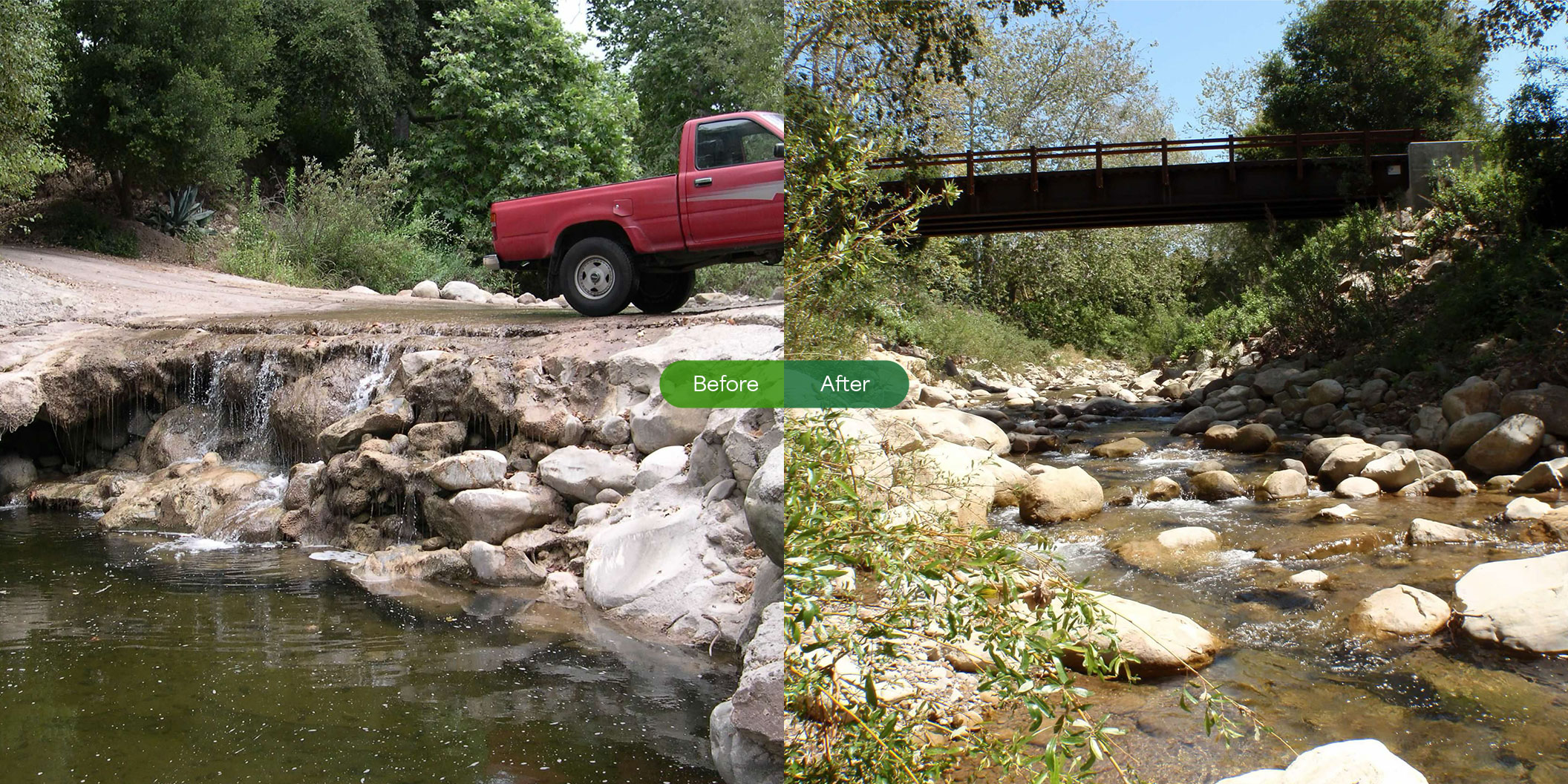 At ranches and other properties throughout the South Coast, it was historically common to create creek crossings by pouring concrete or other low-flow barriers. These barriers get people across the creek but prevent steelhead trout from swimming upstream to spawn. The Southern Steelhead is endangered in our area.