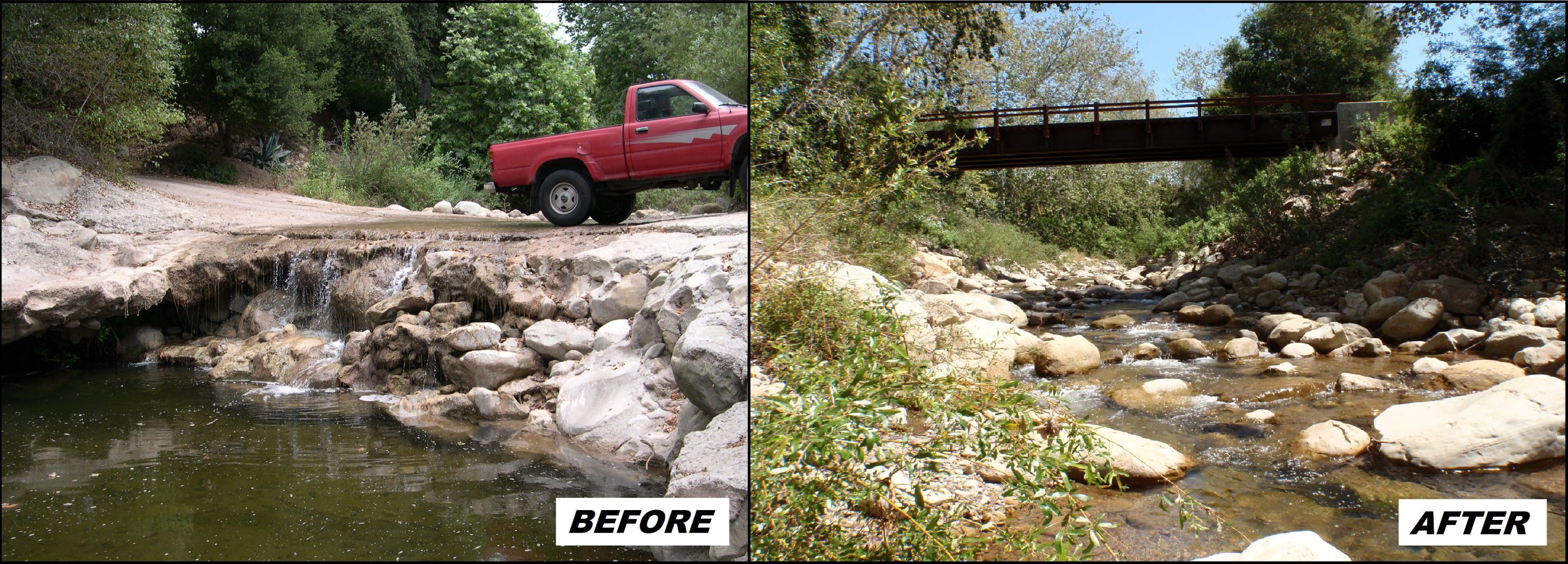 The Bliss Steelhead Restoration Project involved the removal of a low flow crossing which was a major barrier to steelhead migration along the mainstem of Carpinteria Creek. The barrier was the first impassable barrier in the watershed, and resulted from scour on the downstream end of the crossing, which over time resulted in a 10 foot vertical jump height. SCHR worked with partners to secure the necessary permits and implementation funding for the construction of the project from the Department of Fish and Game, Natural Resources Conservation Service and the California Coastal Conservancy as well as other funding sources. The project goals were the removal of the low flow cement crossing from the creek and replacement with a clear spanning bridge in order provide safe passage of the federally endangered steelhead trout as well as year round safe passage across the creek for the property owners.