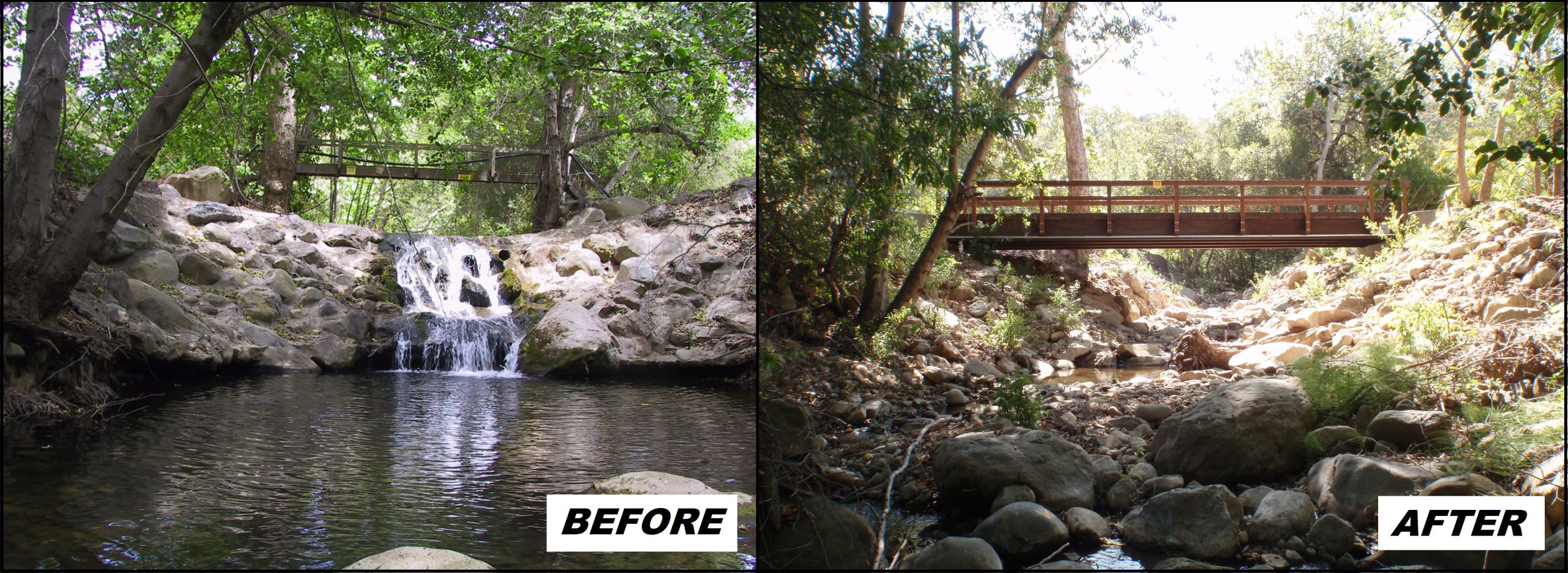 Upper Gobernador Canyon Barrier Removal project was completed in 2011. The fish passage restoration project along Gobernador Creek, removed the last major barrier to fish migration between the headwaters of Gobernador Creek and the Pacific Ocean. The barrier was just downstream of the County debris basin which was modified to allow for fish passage in 2008. The barrier which was removed was a low flow crossing across the creek that created a significant jump height greater than 10 feet that was considered completely impassable to steelhead trout.