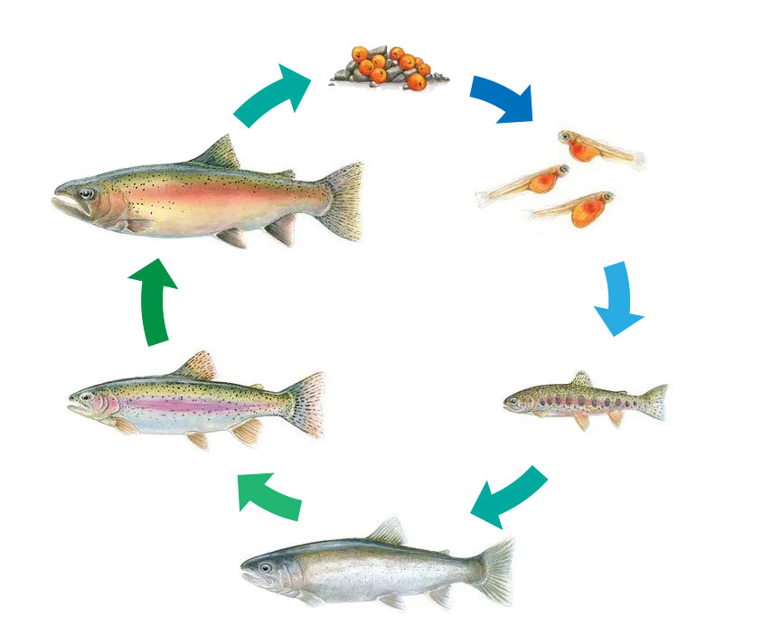 Steelhead migrate from cool fresh water pools to estuaries and the ocean and return to fresh water to spawn. Steelhead trout have a lifespan of up to 11 years (commonly 5 to 8 years) and will complete their journey between land and sea multiple times in their lives.